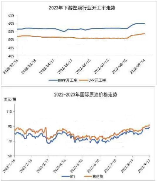 由上图来看,塑膜的开工逐步上升,截止9月14日BOPP开工率在59.80%左右,环比上月同期涨2.9个百分点,CPP开工率为53.75%,较上月同期涨2.5个百分点。进入需求旺季,刚需支持,膜厂订单跟进,膜厂积极开工交单,整体开工负荷提升。随着成本面高企,膜价也成上涨走势。